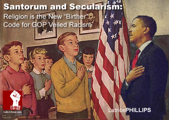 Not the usual “the-President-is-a-Muslim” theme of the last four years of birtherisms. Today’s cover for stirring up racial hatred is that Mr. Obama is now pushing a secular ideology that is similar in many ways, to Santorum and others who intolerantly believe this way about Atheism and non-Christian faiths.